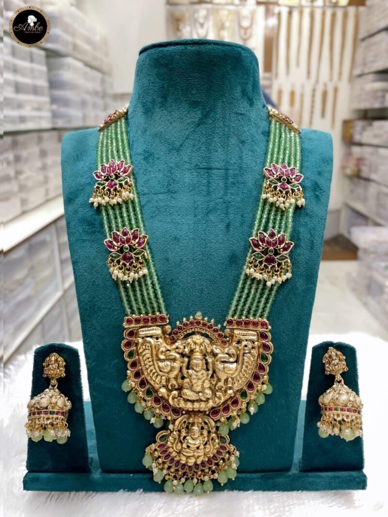 Beautiful Heavy Long Haram set with big Jhumkas for pooja sand festivals