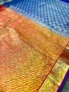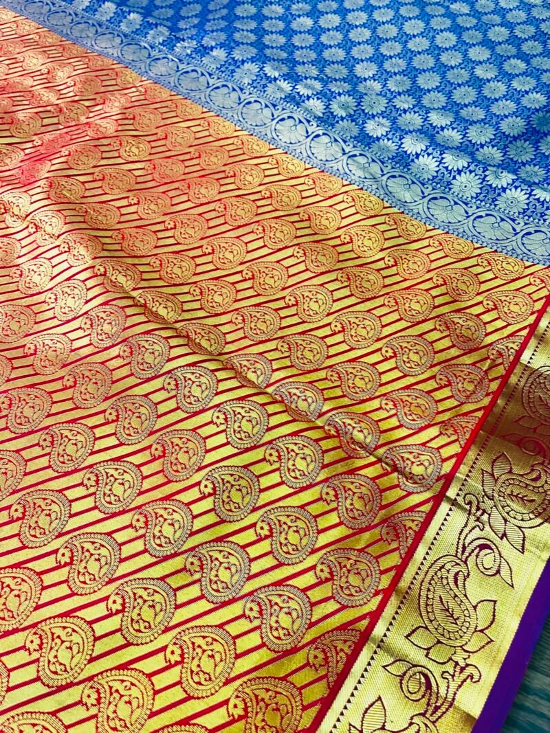 Make heads turn with this elegant Kanchipuram semi bridal saree paired with handwork Aari blouse