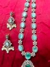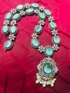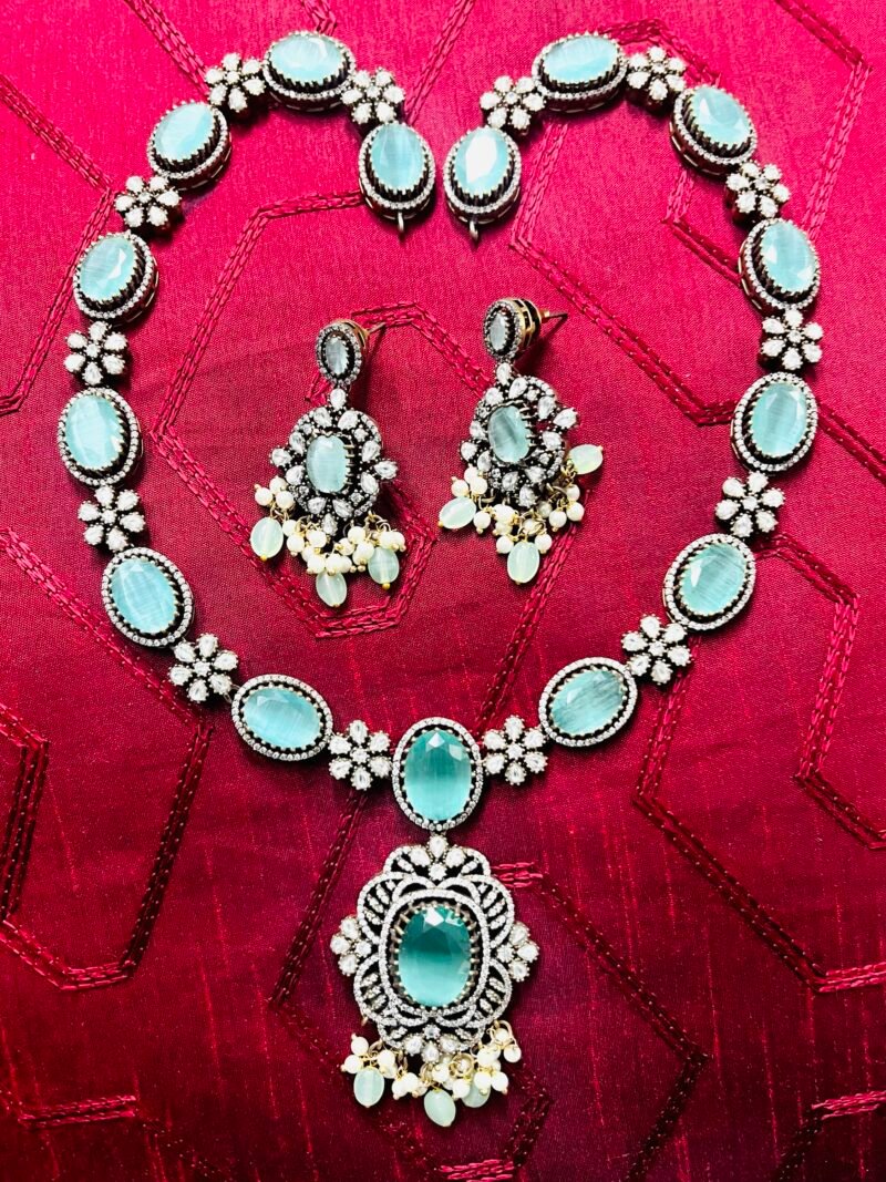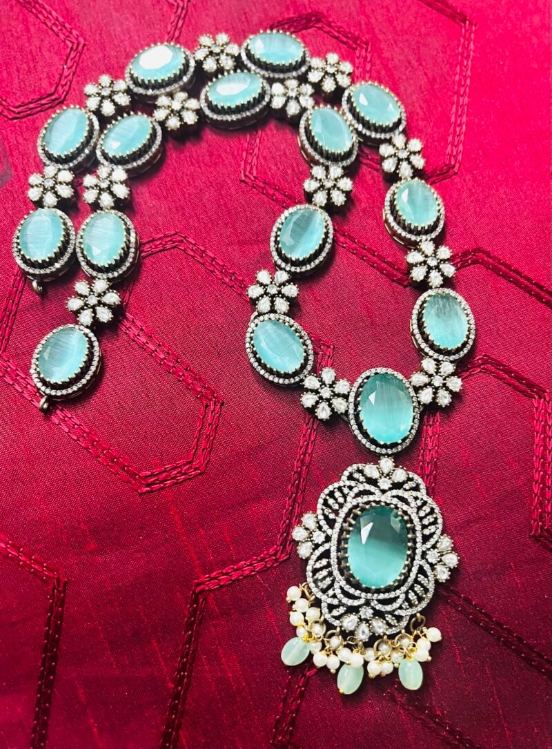 Elevate your look with this stunning turquoise teal long Victorian chain, designed to add a pop of color and effortless elegance to any outfit. Featuring a sleek, lightweight design, this versatile piece showcases rich turquoise and teal tones that evoke ocean hues and tranquil vibes. Perfect for layering or wearing solo, the set drapes beautifully, making it an ideal accessory for both pooja days and party evenings.